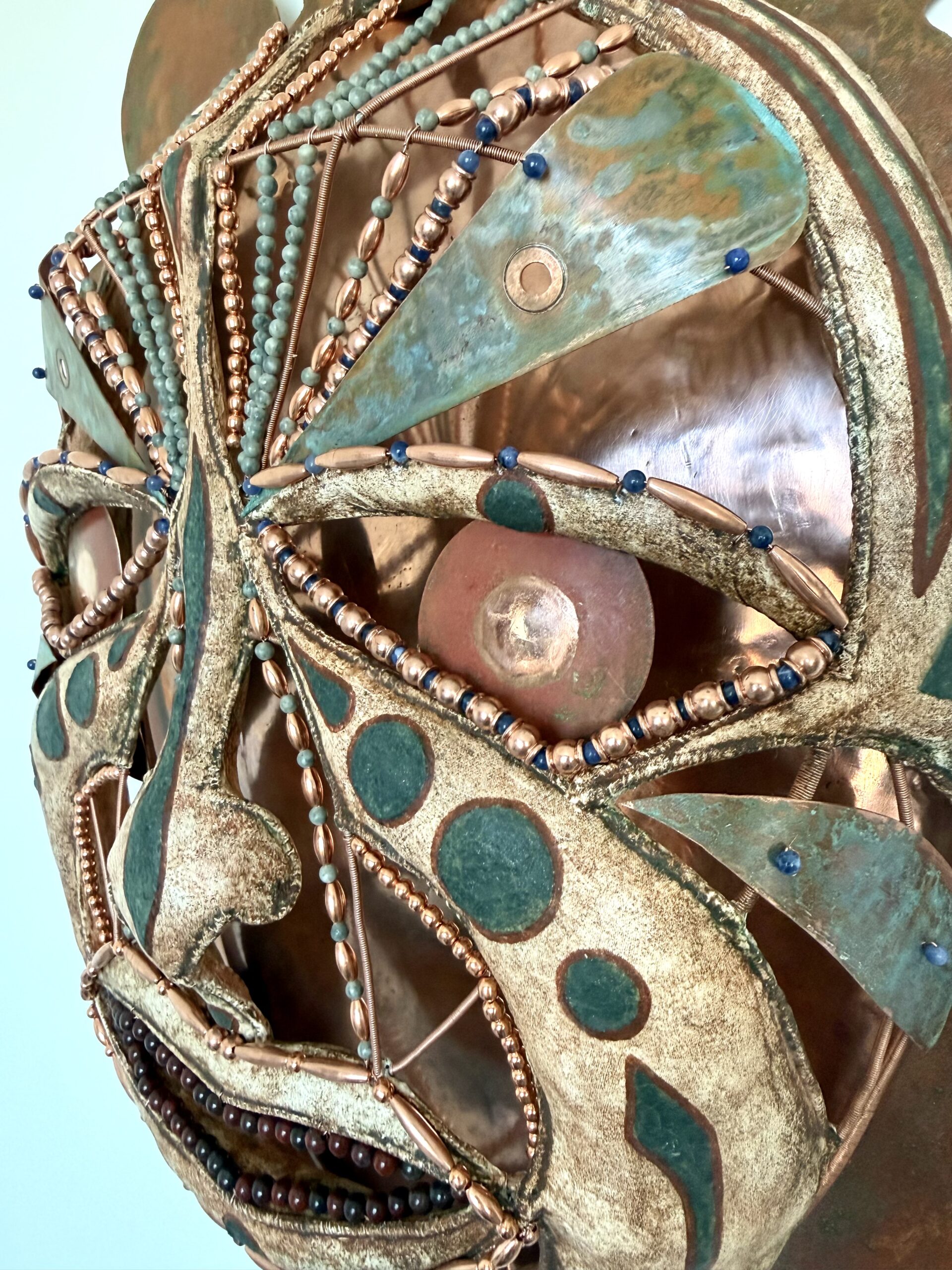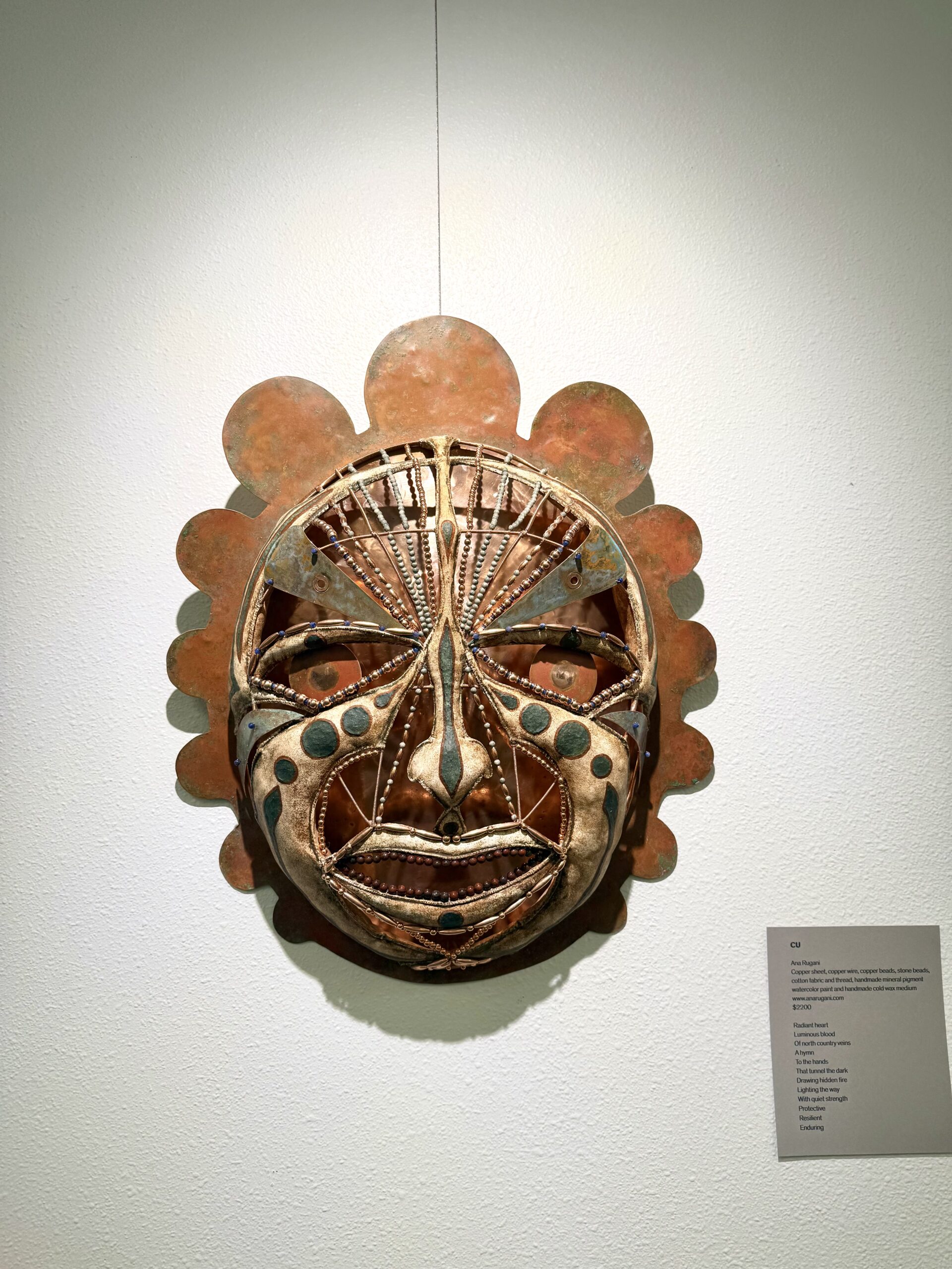 Cu Copper sheet, copper wire, copper beads, stone beads, cotton fabric and thread, handmade mineral pigment watercolor paint, handmade cold wax medium 20.5″x17″x4″